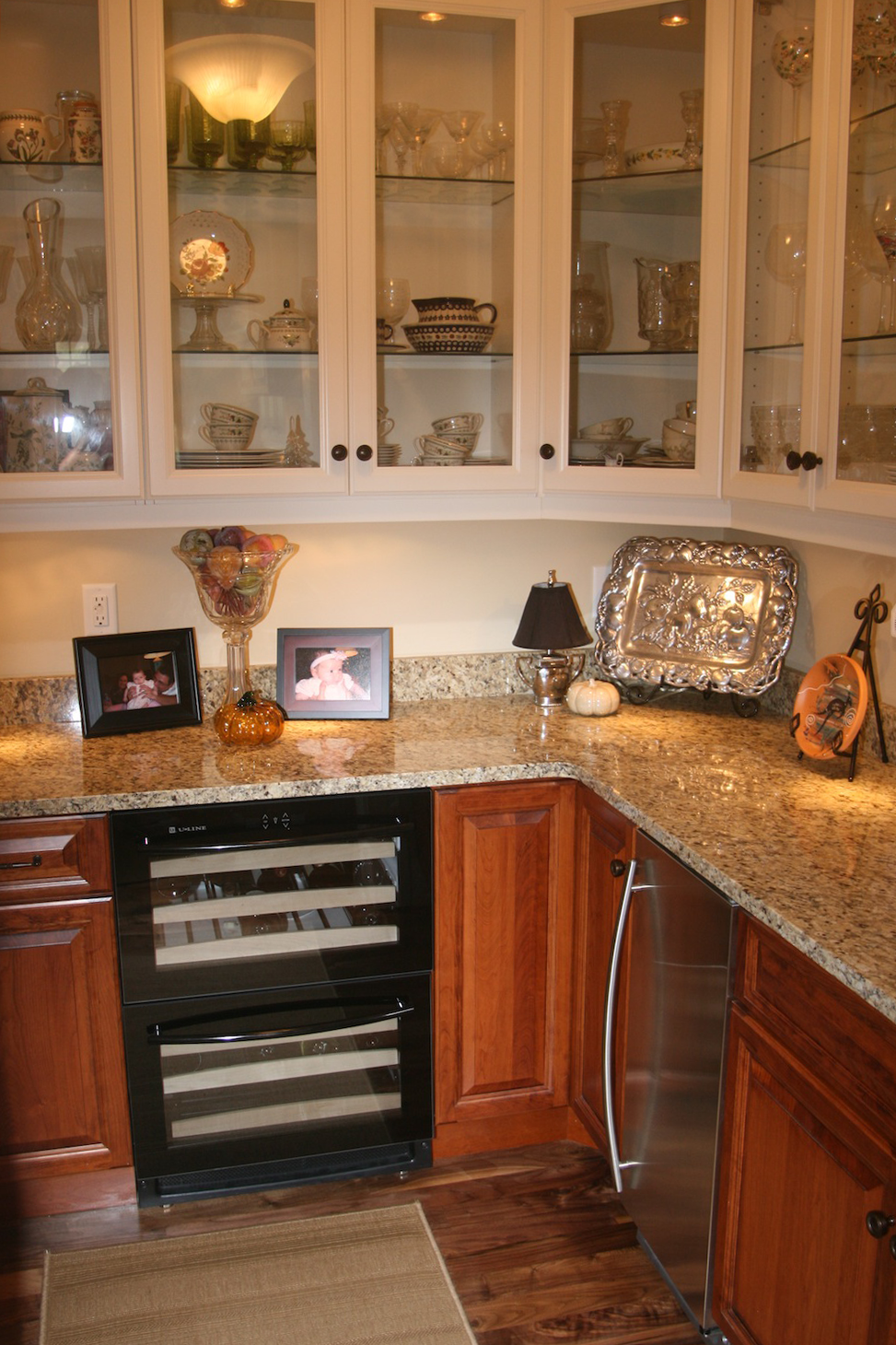 The house is a traditional style that fits in the coastal maritime setting of the Outer Banks and is appointed with walnut and ceramic tile floors throughout. Custom cabinetry in the living room, office, laundry room, and bathrooms with granite countertops. The kitchen and butler’s pantry have two cherry base cabinets with white wall cabinets above and glass transom display cabinets above the wall cabinets.